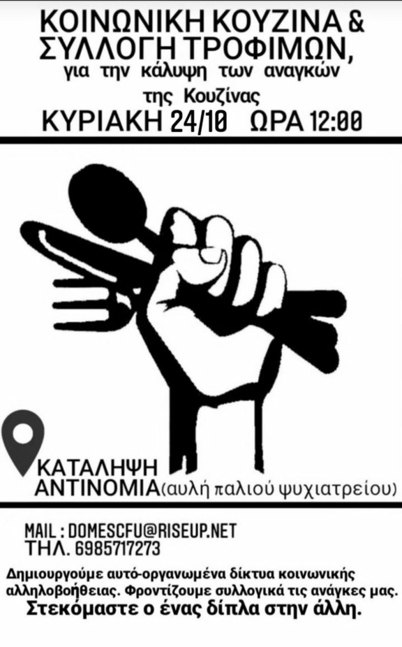 Την ερχόμενη Κυριακή 24/10 στις 12:00 στην Αντινομία (αυλή παλαιού ψυχιατρείου) θα πραγματοποιηθεί Κοινωνική Κουζίνα και Συλλογή Τροφίμων από τις Δομές Κοινωνικής Κουζίνας.
