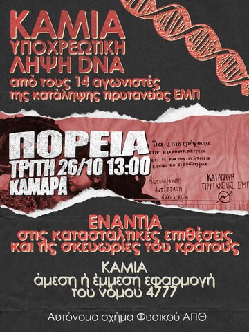 Συγκέντρωση-πορεία ενάντια στην υποχρεωτική λήψη DNA, Τρίτη 26/10 13:00, Καμάρα.