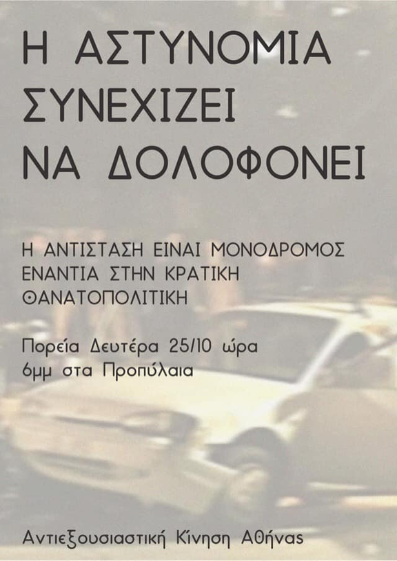 Τη Δευτέρα 25 Οκτωβρίου δίνουμε ραντεβού στις 6:00 στα Προπύλαια για να διαδηλώσουμε ενάντια στην αστυνομική βία και τον ρατσισμό σε βάρος των Ρομά, για να λογοδοτήσουν οι υπεύθυνοι της δολοφονίας στο Πέραμα.