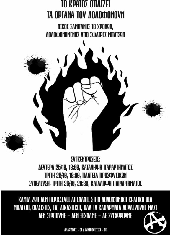 Γνωρίζει πολύ καλά το κράτος και η δικαιοσύνη ποιων το χέρι οπλίζουν. Δεν είναι η πρώτη φορά, ούτε κι η τελευταία, που μπάτσος σηκώνει όπλο, σημαδεύει και πυροβολεί. Οι λόγοι για το κράτος και τους μηχανισμούς του είναι σαφείς: για να επιβληθούν, να καταστείλουν και να τρομοκρατήσουν, γιατί θεωρούν αναλώσιμη τη ζωή όσων το ίδιο το σύστημα έχει πετάξει στο περιθώριο, γιατί όσοι αμφισβητούν την εξουσία πρέπει να τιμωρούνται εκδικητικά και παραδειγματικά, γιατί η δικαιοσύνη είναι ταξική.Να αγωνιστούμε με πάθος για τη ζωή που αξίζει να βιώσουμε, πολεμώντας κράτος, καπιταλισμό και κάθε μορφή εξουσίας. Να συνδέσουμε τους αγώνες, χτίζοντας σχέσεις αγωνιστικής αλληλεγγύης μεταξύ όλων όσοι βιώνουν την καταπίεση και την εκμετάλλευση. Για όλες, όλα, όλους τους δολοφονημένους, τους νεκρούς του κοινωνικού και ταξικού πολέμου, ας ξεχειλίσει η οργή μας.