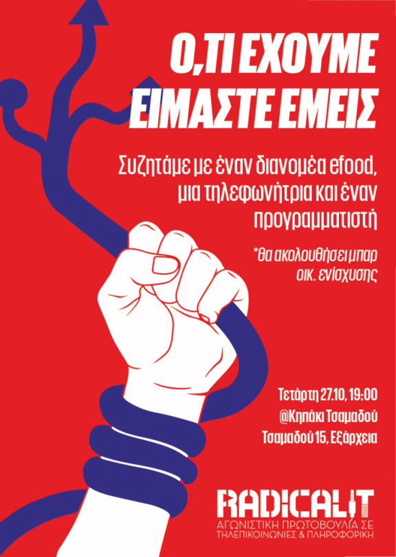 Το Radical I.T. διοργανώνει εκδήλωση την Τετάρτη 27 Οκτώβρη στις 19:00 στο Κηπάκι της Τσαμαδού. Με αφορμή την πρόσφατη νίκη των εργαζομένων στην efood, συζητάμε για τις εργατικές αντιστάσεις στον κλάδο της τεχνολογίας και την αναγκαία αντεπίθεση απέναντι στον νόμο Χατζηδάκη και την κυβερνητική πολιτική.