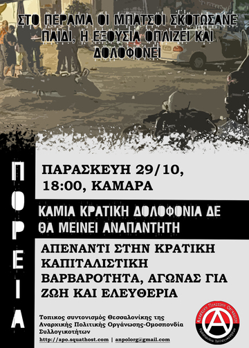 Τα ξημερώματα του Σαββάτου 23/10 όσα συνέβησαν στο Πέραμα είναι ξεκάθαρα μια κρατική δολοφονία. Αμάξι με τρεις επιβαίνοντες καταδιώκεται από την αστυνομία με την υποψία πως είναι κλεμμένο . Με την πρόφαση πως ο οδηγός προσπάθησε να εμβολίσει τις μηχανές των αστυνομικών και πως οι τρεις άνδρες ήταν οπλισμένοι - στοιχεία που αργότερα καταρρίφθηκαν ένα προς ένα- οι αστυνομικοί πυροβολούν σε ευθεία βολή ρίχνοντας 38 σφαίρες, σκοτώνοντας ένα 18χρονο παιδί και τραυματίζοντας τους άλλους 2 επιβαίνοντες.