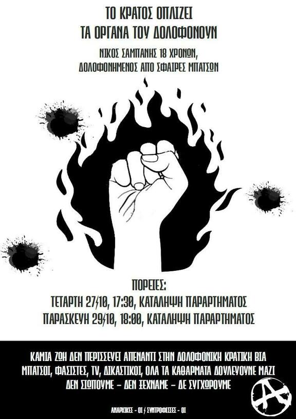 Γνωρίζει πολύ καλά το κράτος και η δικαιοσύνη ποιων το χέρι οπλίζουν. Δεν είναι η πρώτη φορά, ούτε κι η τελευταία, που μπάτσος σηκώνει όπλο, σημαδεύει και πυροβολεί. Οι λόγοι για το κράτος και τους μηχανισμούς του είναι σαφείς: για να επιβληθούν, να καταστείλουν και να τρομοκρατήσουν, γιατί θεωρούν αναλώσιμη τη ζωή όσων το ίδιο το σύστημα έχει πετάξει στο περιθώριο, γιατί όσοι αμφισβητούν την εξουσία πρέπει να τιμωρούνται εκδικητικά και παραδειγματικά, γιατί η δικαιοσύνη είναι ταξική.Να αγωνιστούμε με πάθος για τη ζωή που αξίζει να βιώσουμε, πολεμώντας κράτος, καπιταλισμό και κάθε μορφή εξουσίας. Να συνδέσουμε τους αγώνες, χτίζοντας σχέσεις αγωνιστικής αλληλεγγύης μεταξύ όλων όσοι βιώνουν την καταπίεση και την εκμετάλλευση. Για όλες, όλα, όλους τους δολοφονημένους, τους νεκρούς του κοινωνικού και ταξικού πολέμου, ας ξεχειλίσει η οργή μας.