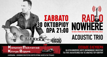 Η πρώτη εμφάνιση των Radio Nowhere εδώ και 2 χρόνια, αυτή τη φορά και με ακουστικό ήχο, αυτό το Σάββατο 30 Οκτωβρίου. Οι Radio Nowhere είναι η μοναδική TRIBUTE BAND στην Ελλάδα, πάνω στη μουσική και τα τραγούδια του BRUCE SPRINGSTEEN. Με τραγούδια καινούργια και παλιά, κλασικά, αγαπημένα, αλλά και πιο ιδιαίτερα, οι Radio Nowhere acoustic trio ξεδιπλώνουν την τραγουδοποιία του BRUCE SPRINGSTEEN σ' ένα ακουστικό σετ, στον χώρο του Κοινωνικού Πολιτιστικού Κέντρου Βύρωνα (Λαμπηδόνα).