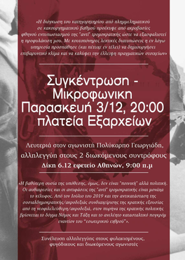 Εν όψη του δικαστηρίου που έχει οριστεί στις 06/12 για τους συντρόφους Π. Γεωργιάδη, Μ.Τ. και την συντρόφισσα Ε.Μ., το οποίο και θα πραγματοποιηθεί καθώς έχει τον αριθμό 1, καλούμε σε συγκέντρωση - μικροφωνική στην Πλατεία Εξαρχείων, την Παρασκευή 03/12, στις 20:00, καθώς και σε συγκέντρωση στο Εφετείο Αθηνών, την Δευτέρα 06/12, στις 09:00.