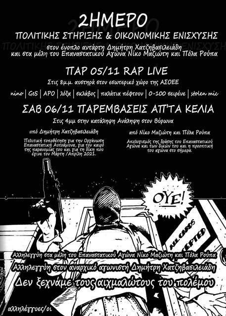 2ήμερο εκδηλώσεων πολιτικής στήριξης και οικονομικής ενίσχυσης στον ένοπλο αντάρτη Δημήτρη Χατζηβασιλειάδη και στα μέλη του Επαναστατικού Αγώνα Νίκο Μαζιώτη και Πόλα Ρούπα.