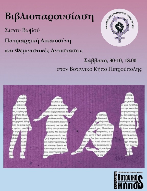Το Σάββατο 30 Οκτωβρίου στις 18:00, στον Βοτανικό Κήπο Πετρούπολης, η Σίσσυ Βωβού θα μας παρουσιάσει το βιβλίο της "Πατριαρχική Δικαιοσύνη και Φεμινιστικές Αντιστάσεις" από τις εκδόσεις "Άνω Τελεία". Θα ακολουθήσει συζήτηση για την έμφυλη βία και τις γυναικοκτονίες που έχουν λάβει χώρα τον τελευταίο καιρό.