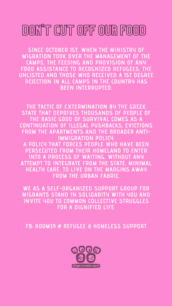 Από την 1η Οκτώβρη που ανέλαβε τη διαχείριση των καμπς το υπουργείο μετανάστευσης, έχει διακοπεί οποιαδήποτε υποστήριξη σίτισης στους αναγνωρισμένους πρόσφυγες, στους μη καταγεγραμμένους και σε όσους δέχτηκαν απορριπτική 1ου βαθμού σε όλα τα καμπς της χώρας.