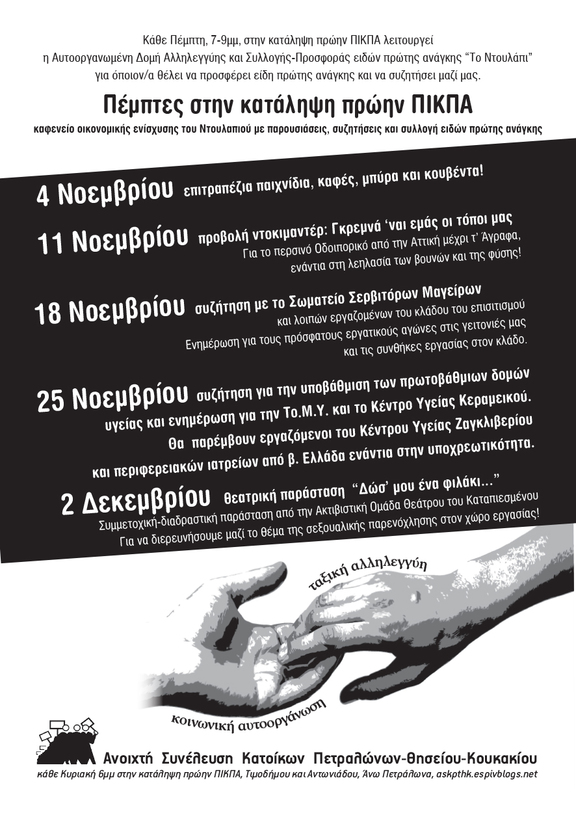 Κάθε Πέμπτη, 7-9μμ, στην κατάληψη πρώην ΠΙΚΠΑ λειτουργεί η Αυτοοργανωμένη Δομή Αλληλεγγύης και Συλλογής-Προσφοράς ειδών πρώτης ανάγκης "Το Ντουλάπι" για όποιον/α θέλει να προσφέρει είδη πρώτης ανάγκης και να συζητήσει μαζί μας.