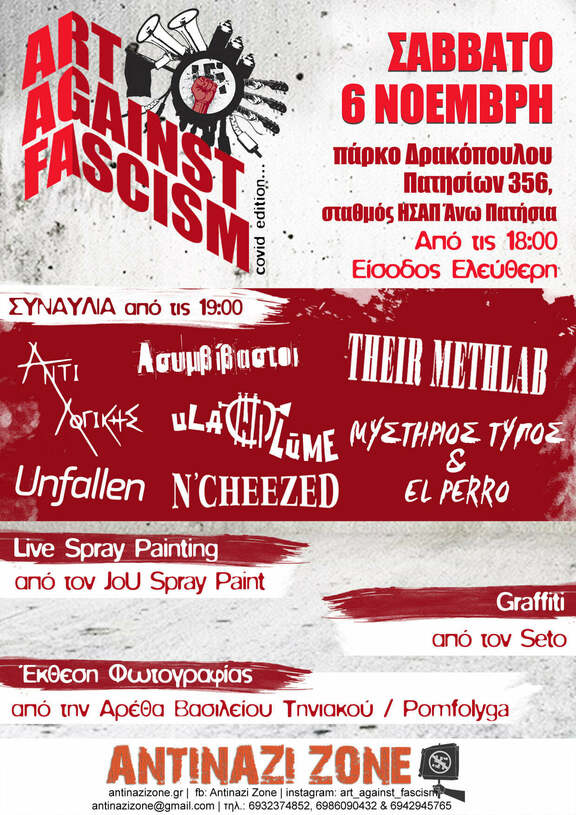 Μετά από 3 πετυχημένα Art against Fascism και ένα αναγκαστικό «διάλειμμα» λόγω των λοκ-ντάουν, ξαναπιάνουμε φέτος το νήμα και διοργανώνουμε ένα νέο Art Against Fascism. Λόγω των περιορισμών που δημιουργεί ακόμα η πανδημία η φετινή διοργάνωση θα είναι μικρότερου μεγέθους και σε ανοιχτό χώρο. Συγκεκριμένα, οργανώνουμε το Art against Fascism στις 6 Νοεμβρίου στο πάρκο Δρακοπούλου (σχεδόν) απέναντι από τον σταθμό του ηλεκτρικού (ΗΣΑΠ) στα Άνω Πατήσια.
