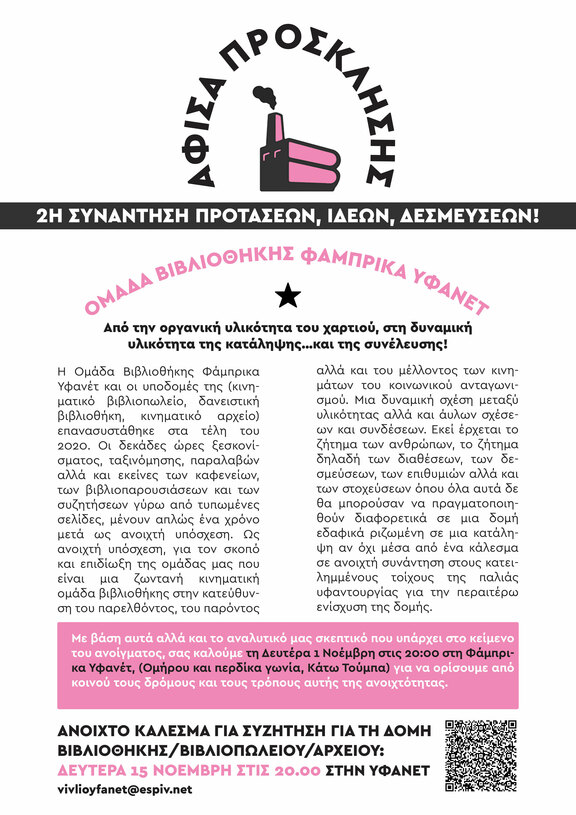 Η Ομάδα Βιβλιοθήκης Φάμπρικα Υφανέτ και οι υποδομές της (κινηματικό βιβλιοπωλείο, δανειστική βιβλιοθήκη, κινηματικό αρχείο) επανασυστάθηκε στα τέλη του 2020. Οι δεκάδες ώρες ξεσκονίσματος, ταξινόμησης, παραλαβών αλλά και εκείνες των καφενείων, των βιβλιοπαρουσιάσεων και των συζητήσεων γύρω από τυπωμένες σελίδες, μένουν απλώς ένα χρόνο μετά ως ανοιχτή υπόσχεση. Ως ανοιχτή υπόσχεση, για τον σκοπό και επιδίωξη της ομάδας μας που είναι μια ζωντανή κινηματική ομάδα βιβλιοθήκης στην κατεύθυνση του παρελθόντος, του παρόντος αλλά και του μέλλοντος των κινημάτων του κοινωνικού ανταγωνισμού. Μια δυναμική σχέση μεταξύ υλικότητας αλλά και άυλων σχέσεων και συνδέσεων. Εκεί έρχεται το ζήτημα των ανθρώπων, το ζήτημα δηλαδή των διαθέσεων, των δεσμεύσεων, των επιθυμιών αλλά και των στοχεύσεων όπου όλα αυτά δε θα μπορούσαν να πραγματοποιηθούν διαφορετικά σε μια δομή εδαφικά ριζωμένη σε μια κατάληψη αν όχι μέσα από ένα κάλεσμα σε ανοιχτή συνάντηση στους κατειλημμένους τοίχους της παλιάς υφαντουργίας για την περαιτέρω ενίσχυση της δομής.
