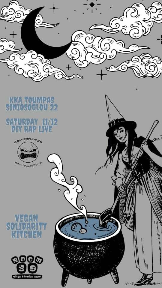 Στο χώρο θα υπάρχει επίσης Vegan Μεταναστευτική Κουζίνα από το Room 39, για τα δικαστικά έξοδα συντρόφου μετανάστη.