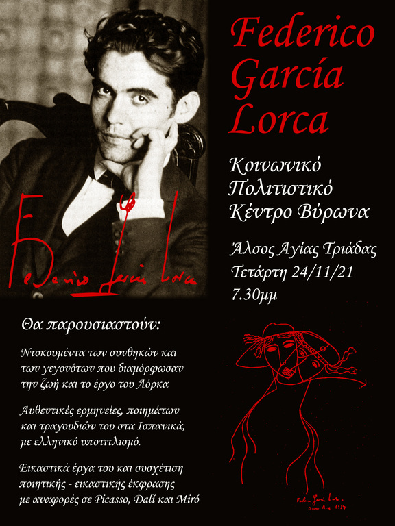 Το Κοινωνικό Πολιτιστικό Κέντρο Βύρωνα σας προσκαλεί στην παρουσίαση της ζωής και του έργου του Φεντερίκο Γκαρθία Λόρκα που θα πραγματοποιηθεί την Τετάρτη 24 Νοεμβρίου στις 7.30μμ και στην προβολή της ταινίας "La novia" (Η νύφη) την Πέμπτη 25 Νοεμβρίου στις 8:30 μμ., στην Λαμπηδόνα (Βύρωνας - Άλσος Αγ. Τριάδας).