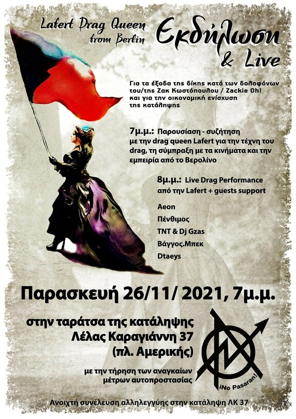 Η θλίψη και η οργή της, γίνονται αφορμή για συλλογική αντιφασιστική δράση, για καλλιτεχνική συνύπαρξη d.i.y. καλλιτεχνών και για τους αγώνες που έρχονται στο δρόμο με ταξικό πρόσημο.Εκδήλωση - συζήτηση για την τέχνη του Drag, το κίνημα στο Βερολίνοκαι για τα Queer-Φεμινιστικά προτάγματα.