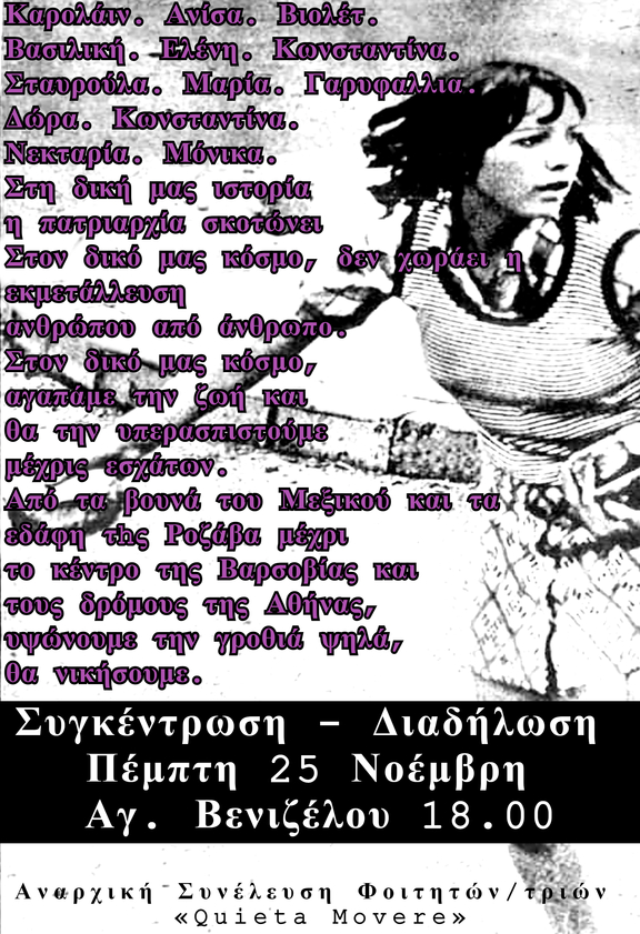 Εμείς, ως αγωνίστριες, ως αναρχικές και ως γυναίκες οργανωνόμαστε και συλλογικοποιούμαστε απέναντι στο κράτος, τον καπιταλισμό και την πατριαρχία. Από τη συμμετοχή στις διαδηλώσεις σε Αθήνα και Θεσ/νίκη όπου εκφράστηκε η κοινωνική δυσαρέσκεια απέναντι στις γυναικοκτονίες, τους βιασμούς και την όξυνση της εξουσιαστικής και ταξικής εκμετάλλευσης των γυναικών και την παρουσία έξω από τις αίθουσες της αστικής δικαιοσύνης που ξεπλένουν τους δράστες, μέχρι τον καθημερινό αγώνα στους δρόμους, μέσα από τις καταλήψεις, τα στέκια, τις πολιτικές μας συλλογικότητες, δίπλα και μαζί με τους συντρόφους μας, έχουμε πάρει θέση μάχης ενάντια στον σάπιο κόσμο της Εξουσίας. Απέναντι στη ζοφερή πραγματικότητα που μας επιφυλάσσουν οι εξουσιαστές σε ολόκληρο τον πλανήτη, προτάσσουμε την οργάνωση των από τα κάτω και τη διεκδίκηση όσων μας ανήκουν. την οργανωμένη ταξική αντεπίθεση όλων των εκμεταλλευόμενων, γυναικών και ανδρών, για την ανατροπή του κόσμου της πατριαρχίας, του κράτους και του καπιταλισμού, για τη δημιουργία μιας κοινωνίας χωρίς εκμετάλλευση και καταπίεση. Οι αγώνες των γυναικών που ξεσπούν σε όλο τον κόσμο μας δείχνουν τον δρόμο του αγώνα, από τις ιθαγενείς Ζαπατίστριες στα βουνά του Μεξικού και τις μαχήτριες της Ροτζάβα μέχρι τις γυναίκες της Πολωνίας και τις αδερφές μας στην Τουρκία που αγωνίζονται ενάντια στην επιβολή των κρατικών πολιτικών πάνω στα σώματά τους. Όλες οι εξεγερμένες σε κάθε γωνιά της γης που στέκονται απέναντι στους δολοφόνους και βιαστές των σωμάτων ασφαλείας. Χέρι - χέρι, η μια δίπλα στην άλλη, στον δρόμο σπάμε τον τρόμο που προσπαθεί να μας επιβάλει το κράτος και οι ένστολοι εντολοδόχοι του. Μαζί τους συναντιόμαστε με μια υψωμένη γροθιά κι ένα βλέμμα αλληλεγγύης, που μας γεμίζει με αποφασιστικότητά να καταστρέψουμε κάθε μορφή εκμετάλλευσης ανθρώπου από άνθρωπο και να φωνάξουμε μαζί με τις αδερφές μας σε όλο τον κόσμο ότι καμία δολοφονία και καμία κακοποίηση δε θα μείνει αναπάντητη, ότι η συλλογική φωνή μας μπορεί να σπάσει όλα τα δεσμά και να ρίξει όλα τα τείχη. Να φωνάξουμε ότι καμία γυναίκα που αγωνίζεται δεν είναι μόνη και θα παλέψουμε όλες μαζί μέχρι να καταφέρουμε να κάνουμε τη φλόγα, φωτιά και να κάψουμε συθέμελα το σάπιο εξουσιαστικό πατριαρχικό σύστημα. Μέχρι να φτιάξουμε έναν κόσμο που δε θα περισσεύει κανείς και καμιά μας, έναν κόσμο που θα χωράει μέσα του όλους τους κόσμους.