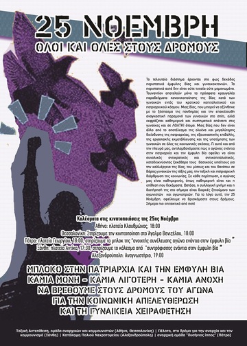 Από την πλευρά μας, (οι αγωνιζόμενες και οι αγωνιζόμενοι,)αντιλαμβανόμαστε πως ο αγώνας ενάντια στην πατριαρχία και την έμφυλη βία οφείλει να μην διεκδικεί απλά ισότιμη θέση με τους άντρες στην καταπίεση, σε ρόλους καταπιεστών ή καταπιεζόμενων, αλλά να είναι συνολικός, να είναι αντικαπιταλιστικός και αντικρατικός, καταδεικνύοντας ξεκάθαρα τους βασικούς υπαίτιους για την καλλιέργεια της βίας, του μίσους και του θανάτου σε βάρος των γυναικών της τάξης μας.