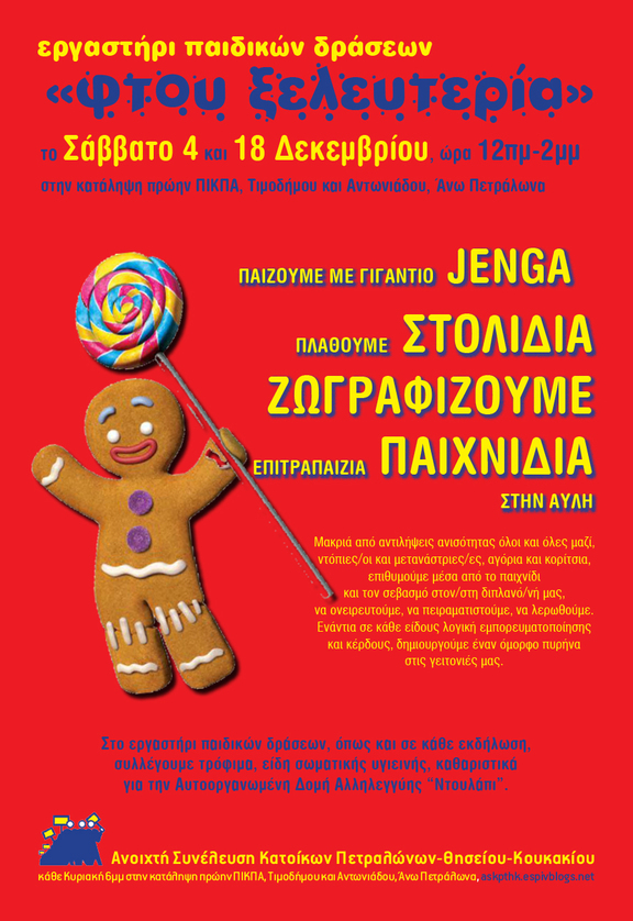 Εργαστήρι παιδικών δράσεων «Φτου Ξελευτερία» το Σάββατο 4 και 18 Δεκεμβρίου, ώρα 12πμ-2μμ, στην κατάληψη πρώην ΠΙΚΠΑ, Τιμοδήμου και Αντωνιάδου, Άνω Πετράλωνα.