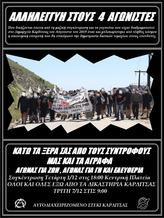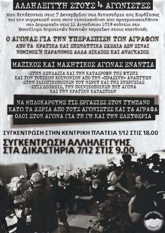 Συγκέντρωση αλληλεγγύης 1/12 στις 18:00 στους 4 αγωνιστές που δικάζονται στις 7 Δεκεμβρίου στα δικαστήρια της Καρδίτσας για την συμμετοχή τους στην κινητοποίηση που πραγματοποιήθηκε στο Δημαρχείο τον Άυγουστο του 2019 μπλοκάροντας το ξεπούλημα δημοτικών δασικών τεμαχίων στους επενδυτές.ΚΑΤΩ ΤΑ ΞΕΡΑ ΣΑΣ ΑΠΟ ΤΟΥΣ ΣΥΝΤΡΟΦΟΥΣ ΜΑΣ ΚΑΙ ΤΑ ΑΓΡΑΦΑ!