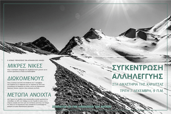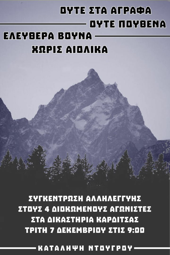 Τα τελευταία χρόνια έχει ξεκινήσει μια προσπάθεια δημιουργίας ενός τεράστιου δικτύου παραγωγής ενέργειας από βιομηχανικού τύπου ανανεώσιμες πηγές σε όλη την επικράτεια, με πρόσχημα την "πράσινη" μετάβαση. Παράλληλα με αυτό το καταστροφικό όργιο επενδύσεων, έχει ξεκινήσει ένα κίνημα αντίστασης σε όλη αυτή την καταστροφική για το περιβάλλον συνθήκη. Ένα μεγάλο μέτωπο αντίστασης με τη στήριξη των τοπικών και όχι μόνο κοινωνιών έχει εδραιωθεί στα βουνά των Αγράφων και στην πόλη της Καρδίτσας. Στα πλαίσια αυτού του αγώνα, το καλοκαίρι του 2019 μετά από διαρκείς κινητοποιήσεις στα χωριά των Αγράφων, ο τότε δήμαρχος Καρδίτσας Φ.Αλεξάκος λίγες ημέρες πριν παραδώσει τη θέση του, επεδίωξε τη δημοπράτηση 38 στρεμμάτων δημοτικής δασικής έκτασης, ώστε να εγκατασταθούν υποδομές μεταφοράς ρεύματος των αιολικών βιομηχανιών. Στις 22 Αυγούστου του 2019 το κίνημα για την υπεράσπιση των Αγράφων κατάφερε να παρεμποδίσει την ολοκλήρωση της διαδικασίας, με πλήθος κόσμου να αποκλείει την είσοδο του δημαρχείου Καρδίτσας. Όπως είναι σύνηθες, ο κρατικός μηχανισμός - διωκτικές αρχές στράφηκαν εναντίον τεσσάρων αγωνιστών με σωρεία αβάσιμων κατηγοριών, αποσκοπώντας στον εκφοβισμό όλων όσων αντιστέκονται. Στις 7/12 θα διεξαχθεί η δίκη της υπόθεσης με μοναδικούς μάρτυρες κατηγορίας μπάτσους και τον πρώην δήμαρχο Φ.Αλεξάκο. Η θέση μας είναι στο πλάι των διωκόμενων και απέναντι στο κράτος, τους μηχανισμούς του και τους επενδυτές.