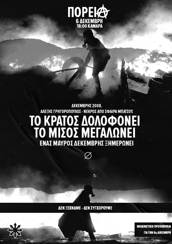 Στις 6/12/2008 ο 15χρονος αναρχικός μαθητής Αλέξανδρος Γρηγορόπουλος δολοφονείται εν ψυχρώ από τον ειδικό φρουρό Ε. Κορκονέα μαζί με τον Β. Σαραλιώτη. Άμεσα, το Κράτος και τα ΜΜΕ επιχείρησαν να αποσιωπήσουν και να αποκρύψουν το γεγονός της δολοφονίας ή να το παρουσιάσουν ως «μεμονωμένο περιστατικό». Η δολοφονία του Α. Γρηγορόπουλου στις 6/12/08 πυροδότησε συγκρούσεις στο κέντρο των μητροπόλεων και έδωσε το έναυσμα για ανυπακοή, αυτοδιεύθυνση και αντιπαράθεση με το κράτος, τους θεσμούς και τους φύλακές τους. Σίγουρα ο Δεκέμβρης του '08 αποτέλεσε σημαντικό σημείο της σύγχρονης ιστορίας και ιδιαίτερα του αναρχικού κινήματος. Τότε φάνηκαν έντονα για μία ακόμη φορά τα σαθρά θεμέλια του σάπιου αυτού κόσμου. Ο Δεκέμβρης αποτελεί σπουδαία παρακαταθήκη για τους σημερινούς μας αγώνες και έχει χαράξει τον δρόμο για την κοινωνική επανάσταση.
