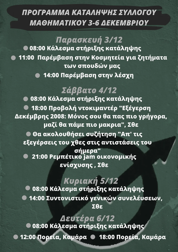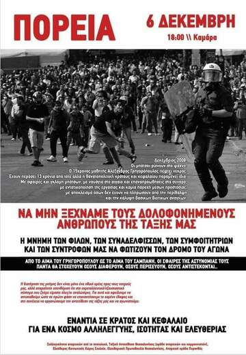 Η νεολαία, μαθητές/τριες και φοιτητές, οι προλετάριοι, εργαζόμενοι/ες και άνεργοι, τα φτωχά κοινωνικά στρώματα, οι μετανάστριες και οι κάθε λογής αποκλεισμένοι και αδικημένοι, αυτοί που κρατούν σφιχτά τον ρου της ιστορίας στα χέρια τους, ξέρουν πως ο Δεκέμβρης του αναρχικού μαθητή Αλέξη, είναι ο Δεκέμβρης όλων των δολοφονημένων από τους ένστολους υπηρέτες του κράτους, των πνιγμένων μεταναστ(ρι)ών στο Αιγαίο, των νεκρών εργατών στα λιμάνια, των φυλακισμένων που νόσησαν και αφέθηκαν να πεθάνουν χωρίς περίθαλψη. Γνωρίζουν, πως ο Δεκέμβρης του Αλέξη είναι ο Δεκέμβρης του Μιχάλη Καλτεζά, του Ιάκωβου Κουμή, της Σταματίνας Κανελλοπούλου, του Λάμπρου Φούντα, του Ζακ Κωστόπουλου (Zackie oh), του Δημήτρη Δαγκλή, του Νίκου Σαμπάνη …