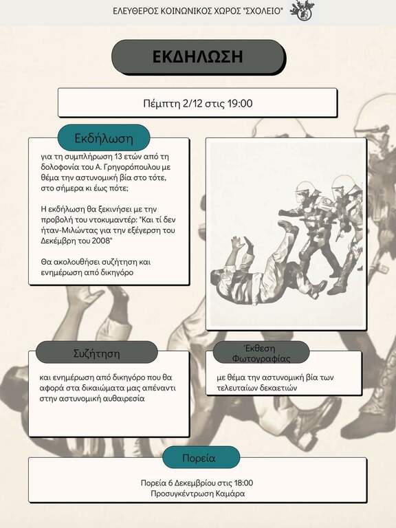 Με αφορμή την επέτειο της δολοφονίας του Αλέξη Γρηγορόπουλου, την Πέμπτη 2/12 στις 19:00, στον Ελεύθερο Κοινωνικό Χώρο Σχολείο, θα πραγματοποιηθεί εκδήλωση με θέμα την εξέγερση του Δεκέμβρη του 2008 και την αστυνομική βία.