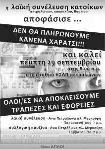 Παράλληλα με την οργάνωση της αλληλεγγύης και της αυτοάμυνάς μας θέτουμε σε κίνηση και κάποιες συμβολικές δράσεις με ουσιαστικό, όμως, περιεχόμενο. Έτσι, νωρίς το πρωί της Πέμπτης καλούμε σε συγκέντρωση στον ηλεκτρικό σταθμό των Πετραλώνων (από τη μεριά των Άνω Πετραλώνων) για να πραγματοποιήσουμε δράσεις σε οικονομικά κέντρα της γειτονιάς.