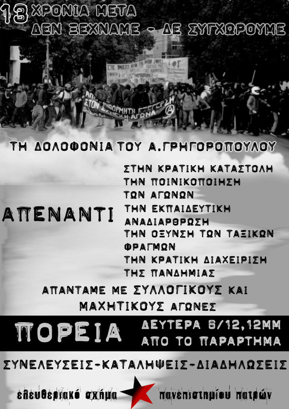 13 χρόνια έχουν περάσει από την στυγνή δολοφονία του 15χρονου μαθητή Αλέξη Γρηγορόπουλου από τον ειδικό φρουρό Κορκονέα και τον συνεργό του Σαραλιώτη. Ένα περίπου χρόνο πριν την παγκόσμια έκρηξη της κρίσης που έφερε και την χώρα μας στα μνημόνια, ο φόβος των αστικών κυβερνήσεων και της αστυνομίας για τους αγώνες της νεολαίας και των φτωχών λαϊκών στρωμάτων όπλισε το χέρι του Κορκονέα. Η δολοφονία ξεχείλισε το ποτήρι, πυροδοτώντας μια νεολαιίστικη εξέγερση, που είχε βαθύτερες αιτίες την φτώχεια, ανεργία, περιθωριοποίηση, την χρεωκοπία του ελληνικού καπιταλισμού - και ήταν προάγγελος του παρατεταμένου κοινωνικού πολέμου 2010-12.