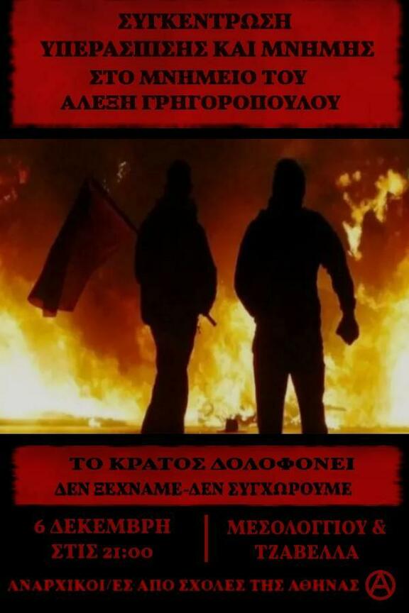 Συγκέντρωση: 6 Δεκέμβρη στις 21:00, στο μνημείο του Αλέξανδρου Γρηγορόπουλου (Μεσολογγίου και Τζαβέλλα)