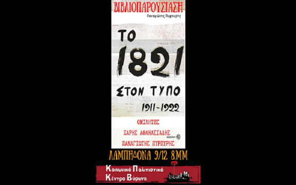 Οι εκδόσεις Δωδώνη και το Κοινωνικό Πολιτιστικό Κέντρο Βύρωνα σας προσκαλούν στην παρουσίαση του βιβλίου "Το 1821 στον Τύπο 1911-1922" του Παναγιώτη Πυρπυρή, που θα πραγματοποιηθεί στη Λαμπηδόνα την Πέμπτη 9/12 στις 8 μμ. Θα μιλήσουν ο Χάρης Αθανασιάδης (Καθηγητής Δημόσιας Ιστορίας, Πανεπιστήμιο Ιωαννίνων) και ο συγγραφέας.