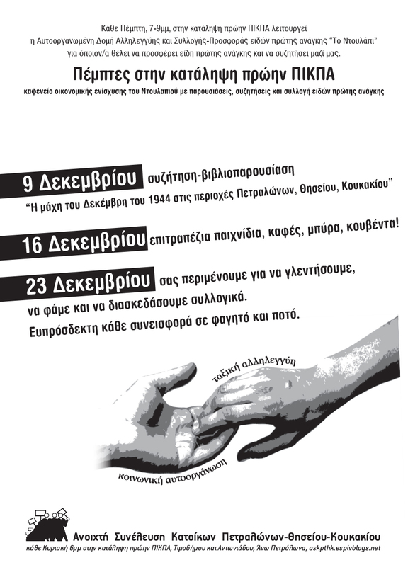 Κάθε Πέμπτη, 7-9μμ, στην κατάληψη πρώην ΠΙΚΠΑ λειτουργεί η Αυτοοργανωμένη Δομή Αλληλεγγύης και Συλλογής-Προσφοράς ειδών πρώτης ανάγκης "Το Ντουλάπι" για όποιον/α θέλει να προσφέρει είδη πρώτης ανάγκης και να συζητήσει μαζί μας.