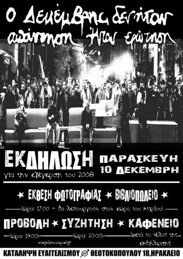 " Γιατί μετά από 13 ολόκληρα χρόνια να κάνουμε μία εκδήλωση για την εξέγερση του 2008? Τί είναι αυτό που μας ωθεί να ξαναδούμε και να ξαναπούμε για τα γεγονότα? Μήπως τα δεκεμβριανά τείνουν να γίνουν μία ευχάριστη παλιά ανάμνηση "βγαλμένη από ταινία"? Πώς οδηγηθήκαμε σε μία από τις πιο σημαντικές στιγμές για την ιστορία των αναρχικών στον ελλαδικό χώρο? Τί ακολούθησε μετά τον κατευνασμό των ταραχών? Οι νεότερες γενιές συντρόφων τί ακριβώς θεωρούν ότι έγινε το Δεκέμβρη? Tί αποκομίσαμε και τί πήγε "στραβά" ? Γιατί τα μηνύματα της εξέγερσης παραμένουν επίκαιρα, ακόμα και στη δυστοπία των κρίσεων και των lockdown?"