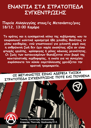 Οι άθλιες συνθήκες διαβίωσης στα στρατόπεδα συγκέντρωσης ανά την επικράτεια, όπου οι άνθρωποι αναγκάζονται να ζουν έγκλειστοι, χωρίς ρεύμα, θέρμανση και τρεχούμενο νερό, στοιβαγμένοι σε σκηνές, ο παρατεταμένος εγκλεισμός τους μέσα στα κέντρα κράτησης με πρόσχημα την πανδημία, η παντελής έλλειψη ιατροφαρμακευτικής περίθαλψης αλλά και οποιασδήποτε άλλης πρόληψης αναφορικά με τα μέτρα για την αποφυγή της διασποράς του covid-19, η συνεχής απομόνωσή τους από τα κέντρα των μητροπόλεων αλλά και της κοινωνίας της ίδιας και η καταστολή οποιασδήποτε αντίστασης είτε με την βία των ΜΑΤ είτε μέσω της τρομοκρατίας των pushbacks και των απελάσεων καθιστούν για μία ακόμη φορά έκδηλο το πλέον προφανές: η διαχείριση των μεταναστευτικών ροών είναι μια διαχείριση εξόντωσης και το κράτος κατέχει το μονοπώλιο της βίας είτε απέναντι στους/στις μετανάστες/μετανάστριες είτε απέναντι στους αλληλέγγυους και σε όποιον επιχειρεί να σηκώσει κεφάλι ενάντια στις δολοφονικές προσταγές του. Η φρίκη των στρατοπέδων συγκέντρωσης, όπου απουσιάζουν ακόμα και οι στοιχειώδεις υποδομές κάλυψης των βασικών αναγκών και η διαρκής καταναγκαστική απομόνωση των ανθρώπων αυτών συνιστούν ένα ξεκάθαρο κρατικό-καπιταλιστικό έγκλημα ενάντια στην ανθρωπότητα
