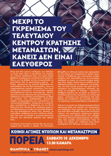 Το κράτος έχει επενδύσει στον φόβο και προσπαθεί να κυβερνήσει με βάση αυτόν, στρέφοντας τον έναν ενάντια στην άλλη. Προσπαθεί δηλαδή να κατασκευάσει τους μετανάστες ως απειλή για την υπόλοιπη κοινωνία, για να δώσει την ψευδαίσθηση ότι την κρατάει ασφαλή από τους κινδύνους. Ο πιο μεγάλος κίνδυνος όμως είναι η πολιτική του. Ντόπιοι και μετανάστες μπορεί να νοιώθουμε ότι είναι πολλά αυτά που μας χωρίζουν, όμως οι κοινές μας αρνήσεις και επιθυμίες δημιουργούν τους τόπους συνάντησης που αψηφούν τις κρατικές πολιτικές και επιτίθονται στον κοινωνικό κανιβαλισμό.