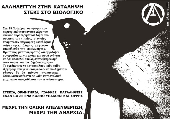 Aπό τις μαζικές πορείες και συγκρούσεις ενάντια στο νόμο Κ/Χ και στην πανεπιστημιακή αστυνομία, την κατάληψη της πρυτανείας, τα πεσίματα στους μπάτσους, τις διαφόρων ειδών παρεμβάσεις έως τις πρόσφατες επιθετικές ενέργειες με ορμητήριο το πολυτεχνείο, γίνεται ξεκάθαρο πως η πάταξη της ανομίας εντός κάθε πανεπιστημιακού χώρου αποτελεί πρώτη προτεραιότητα κράτους-μπάτσων-πρυτανικών αρχών. Άλλωστε, η εικόνα του πανεπιστημιακού campus, στο κέντρο της πόλης οφείλει να είναι αψεγάδιαστη. Έτσι, λοιπόν, στο στόχαστρο της καταστολής έχει τεθεί η κατάληψη Στέκι στο Βιολογικό.