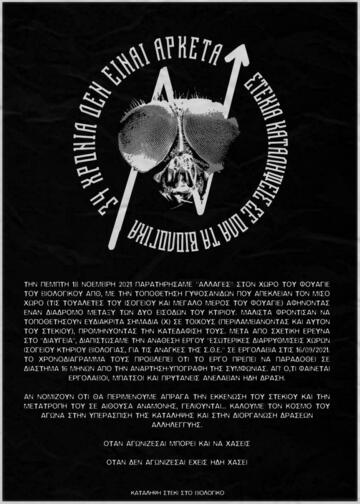 "Την Πέμπτη 18 Νοέμβρη 2021, παρατηρήσαμε κάποιες "αλλαγές" εντός του κτηρίου του Βιολογικού και συγκεκριμένα στο χώρο του φουαγιέ, με την τοποθέτηση γυψοσανίδων που απέκλειαν το μισό χώρο, αφήνοντας ένα διάδρομο μεταξύ των δύο εισόδων του κτηρίου. Μάλιστα είχαν το θράσος να αφήσουν κάποια ευδιάκριτα σημάδια σε τοίχους, περιλαμβάνοντας τοίχο του στεκιού και προμηνύοντας την κατεδάφισή τους.