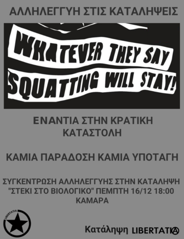 Από την πλευρά μας, ως κατάληψη Libertatia προτάσσουμε ανυποχώρητη αλληλεγγύη στις δομές αγώνα, που μπαίνουν στο στόχαστρο κράτους και κεφαλαίου και καταστέλλονται. Οι καταλήψεις για εμάς είναι σημεία συνάντησης και ζύμωσης, όπου συλλογικοποιούμε τους αγώνες μας προτάσσοντας μια ελεύθερη κουλτούρα αντίστασης στον σημερινό κανιβαλιστικό τρόπο οργάνωσης της κοινωνίας και ως τέτοιες τις υπερασπιζόμαστε. Με όπλο μας τη συντροφικότητα και την αλληλοβοήθεια στεκόμαστε απέναντι σε οτιδήποτε επιχειρεί να καταστείλει τους ζωτικούς μας χώρους, εμάς τους ίδιους αλλά και τους αγώνες μας. Για αυτό επιδιώκουμε να συνεχίσουν ναι είναι το μεγαλύτερο εμπόδιο που βρίσκουν απέναντί τους όσοι επιχειρούν να μας εξουσιάσουν, ώσπου να κτίσουμε μια κοινωνία που η ισότητα, η αλληλεγγύη και η ελευθερία θα είναι λέξεις αυτονόητες.
