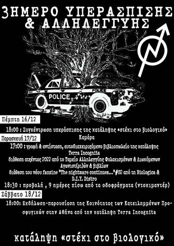 The Biologic squat, being a consistent space of resistance for the last 34 years inside the university's campus of the Aristotle University of Thessaloniki (AUTH), has hosted a number of groups, individuals, ideas and actions which don't get limited by borders, bars and fences. Currently, the squat provides spaces for the squat Terra Incognita, the Solidarity Fund for Prisoners and Persecuted Fighters, the Biologica which they coordinate through the political administrative assembly of the self-organised space. Apart from the activity of groups and collectives, various initiatives of individuals are carried out in the place, which aim at the diffusion of ideas and propaganda through counter-information tools, self-education and "fermentation" with topics which concern both student struggles and the broader social struggles within and outside the metropolitan field.