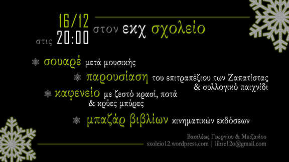 Σας (προσ)καλούμε σε ολίγον τί εορταστικό μα σίγουρα συλλογικό σουαρέ μετά μουσικής, ζεστού οίνου και κρύων μπύρων την Πέμπτη 16 Δεκεμβρίου 2021 και ώρα 20:00 (και μετά) στον Ελεύθερο Κοινωνικό Χώρο Σχολείο.
