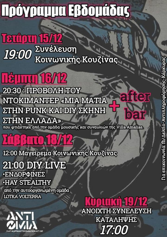 *Πέμπτη 16/12 από τις 20:30 Προβολή ντοκυμαντέρ "Μια ματιά στην punk και diy σκηνή στην ελλάδα" και μπάρ οικονομικής ενίσχυσης της συναυλιακής ομάδας Lotka Volterra Collective.