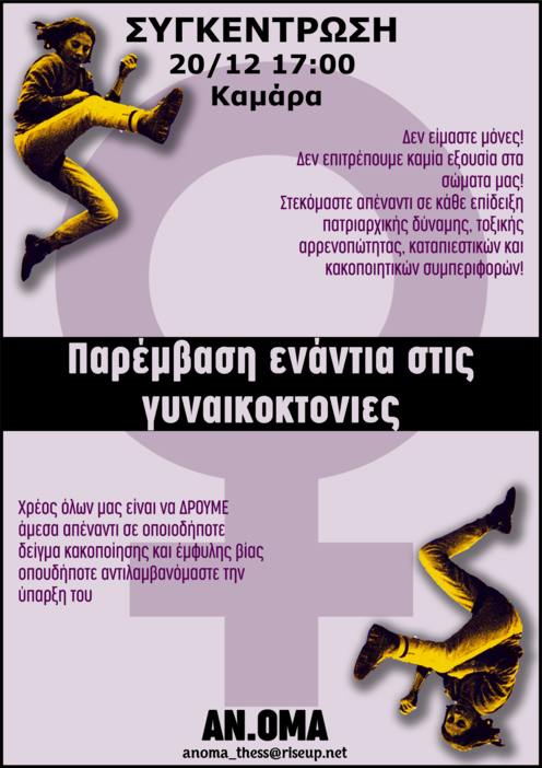 Συμμετέχουμε στη συγκέντρωση ενάντια στις γυναικοκτονίες και στην έμφυλη βία την Δευτέρα 20/12 στις 17:00 στη Καμάρα!