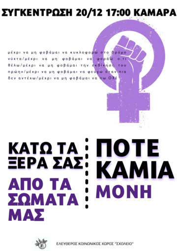 Δεν είμαστε μόνες! Δεν επιτρέπουμε καμία εξουσία στα σώματα μας! Στεκόμαστε απέναντι σε κάθε επίδειξη πατριαρχικής δύναμης, τοξικής αρρενοπώτητας, καταπιεστικών και κακοποιητικών συμπεριφορών!