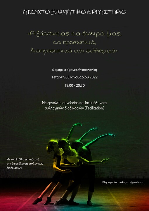 συμπεριφορά μας και τα συναισθήματα μας. Στο σύντομο ανοιχτό βιωματικό εργαστήριο "Ριζώνοντας τα όνειρα μας, τα προσωπικά, διαπροσωπικά και συλλογικά" θα προσπαθήσουμε να προσεγγίσουμε αντιλήψεις, συμπεριφορές και εργαλεία προς την κατεύθυνση της βιωσιμότητας των συλλογικών εγχειρημάτων που ποθούν την κοινωνική αλλαγή και όχι μόνο. Μέσα στο εργαστήριο θα πειραματιστούμε συνδέοντας τα διαφορετικά επίπεδα μιας ομάδας, με την πρόθεση δημιουργίας γεφυριών ανάμεσα σε: Προσπάθεια και Επιθυμία, Ρεαλισμό και Ουτοπία, Πράξη και Νόημα.