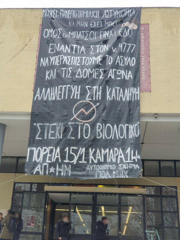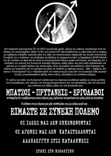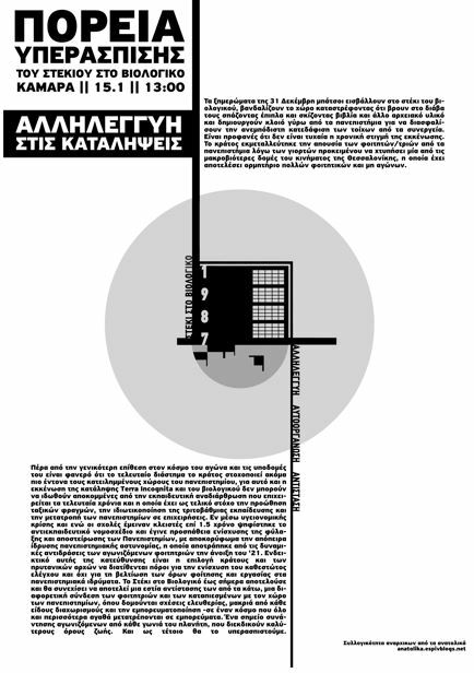 Τα ξημερώματα παραμονής Πρωτοχρονιάς το Στέκι του Βιολογικού στο campus του ΑΠΘ μετά από 34 χρόνια ζωής και αγώνα εκκενώθηκε. Καμία έκπληξη δεν αποτελεί για εμάς, οτι το Κράτος και η Διοίκηση του ΑΠΘ επέλεξαν μια τέτοια μέρα να προχωρήσουν σε μια προφανέστατα μεθοδευμένη κίνηση εκκένωσης καταλήψεων που αποτελούν κέντρο αγώνα και δημιουργίας για όλες τις καταπιεσμενες. Με τα κρούσματα να αγγίζουν τα 40.000, τον ενα νεκρό μετά τον άλλον και το ΕΣΥ ενα βήμα μετά την κατάρρευση, και το επιτελικό κράτος βάζει στο στόχαστρο όσες και όσους ειναι ακομη εδω να αντιδρούν. Όπως όμως αποδείξαμε με την άμεση και αυθόρμητη συγκέντρωση κοντά στον χώρο του ΑΠΘ και την πορεία που ακολούθησε εκείνη την ημέρα δεν πρόκειται να μείνει καμία τέτοια κίνηση αναπάντητη. Το "Βιολογικό" και οι αγώνες μας θα συνεχίσουν να υπάρχουν παρά την καταστολή και το κράτος που θέλει ένα πανεπιστήμιο τσιφλίκι των "αρίστων" και των επενδυτών. Φυσικά το κράτος, λίγες μέρες μετά, προχώρησε και σε δεύτερη εκκένωση του χώρου που είχαν ανακαταλάβει οι σύντροφοι/ισσες από το στέκι, κάνοντας μάλιστα προσαγωγές και βανδαλίζοντας τον νέο κατειλημμένο χώρο.