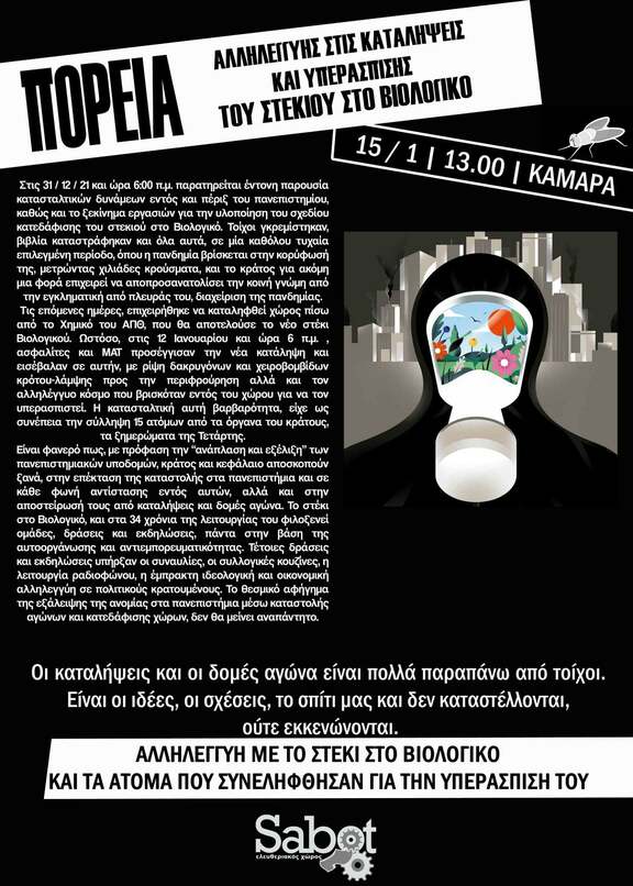 Κράτος, μπάτσοι και πανεπιστημιακές αρχές αποφάσισαν στις 31/12/2021 να εκτελέσουν την πράξης μιας προαναγγελθείσας εκκένωσης. Μετά από ανεπίσημες απειλές ετών για επικείμενη εισβολή στην κατάληψη "Στέκι στο Βιολογικό", τον Σεπτέμβρη υπεγράφη συμφωνία έργου και ανάθεσή του σε εργολαβία, με στόχο την "αναδιαμόρφωση" και την "αξιοποίηση" των χώρων στο ισόγειο του κτιρίου Βιολογίας. Φυσικά συμπεριέλαβαν τον χώρο του στεκιού στα νέα σχέδια, με πρόθεση κατεδάφισης των γύρω τοίχων και την μετατροπή του σε γραμματεία και αίθουσα αναμονής. Παραμονή Πρωτοχρονιάς, όπως και το μακρινό 1992 - βέβαια τότε έχτισαν την πόρτα του στεκιού - το campus περικυκλώνεται από κλούβες και διμοιρίες, ενώ δεκάδες ασφαλίτες κατευθύνονται προς το στενό του στεκιού. Εισβάλλουν στην κατάληψη και αφού κάνουν ενδελεχή έρευνα, καταστρέφοντας οτιδήποτε υπήρχε στο στέκι και φωτογραφίζοντας τα τρομερά ευρήματά τους, δίνουν σκυτάλη στους εργάτες που έχουν αναλάβει να φέρουν εις πέρας την πρώτη φάση του έργου, την κατεδάφιση των τοίχων. Μετά τις παρεμβάσεις τους το στέκι, αλλά και υπόλοιποι χώροι του ισογείου μοιάζουν να χουν βανδαλιστεί. Δεν αμφιβάλαμε ποτέ για το μίσος κράτους, μπάτσων και πανεπιστημιακών ρουφιάνων απέναντι σε χώρους ελευθερίας.