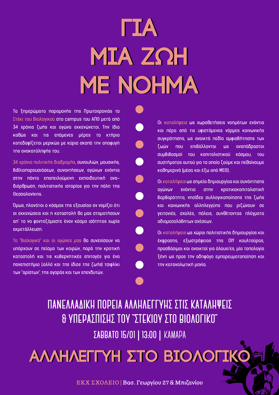 Για 34 συνεχόμενα χρόνια η κατάληψη του Βιολογικού αποτελεί πνεύμονα ελευθερίας μέσα στην αστική και εξουσιαστική ασφυξία. Δεκαετίες ολόκληρες ο χώρος έχει γεννήσει και στεγάσει πολιτικές και πολιτιστικές συλλογικότητες, δομές αντίστασης, αλληλεγγύης και αλληλοβοήθειας, αγώνες και αντιστάσεις τόσο εντός όσο και εκτός της πανεπιστημιακής κοινότητας. Αναρίθμητες πολιτικές και πολιτιστικές εκδηλώσεις, συναυλίες, συζητήσεις, συνελεύσεις, καφενεία, κουβέντες έχουν αφήσει σε αυτά τα 34 χρόνια, ένα στίγμα συνοδοιπορίας με την ίδια την ανάπτυξη του τοπικού αναρχικού-αντιεξουσιαστικού και ευρύτερου ανταγωνιστικού κινήματος.