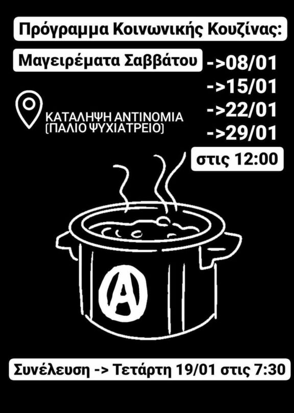 Τα μαγειρέματα και οι συνελεύσεις γίνονται στον χώρο της Κατάληψης Αντινομία (παλαιό ψυχιατρείο).