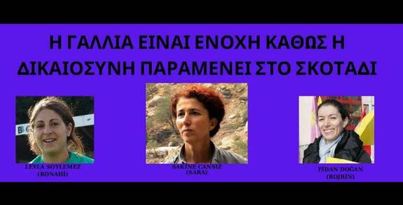 Στις 9 Ιανουαρίου του 2013 τρεις Κούρδισσες επαναστάτριες, η Sakine Cansız (Sara), η Fidan Doğan (Rojbîn) και η Leyla Şaylemez (Ronahî) δολοφονήθηκαν στο Παρίσι. Οι δράστες δεν έχουν ακόμη προσαχθεί στη δικαιοσύνη. Σας καλούμε να συμμετάσχετε μαζί μας στη διαδήλωση (συγχρονισμένη με εκδηλώσεις και διαδηλώσεις σε όλη την Ευρώπη), η οποία θα τιμήσει τη μνήμη των γυναικών μαρτύρων και θα διαμαρτυρηθεί για το έγκλημα της Τουρκίας και την αδράνεια της Γαλλίας.