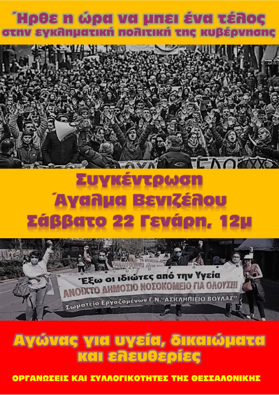 Όλοι και όλες στις συγκεντρώσεις και στις διαδηλώσεις του ερχόμενου Σαββάτου 22 Ιανουαρίου στην Αθήνα στις 12.00 στην πλατεία Συντάγματος και στην Θεσσαλονίκη στις 12.00 στο Άγαλμα του Βενιζέλου.