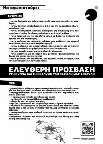 Είναι εμφανές ότι όσο η κυβέρνηση αρνείται να αναλάβει την πολιτική ευθύνη για τους 21.000 νεκρούς από την πανδημία, που θα μπορούσε ήδη να έχει αναχαιτίσει, άλλο τόσο αρνείται να ενισχύσει το αποδυναμωμένο σύστημα υγείας, μιας και την αδυναμία του την καρπώνονται οι ιδιώτες. Η δωρεάν, πρόσβαση σε ικανές υγειονομικές δομές για όλο το σύνολο της κοινωνίας, χωρίς ταξικούς, κοινωνικούς και φυλετικούς διαχωρισμούς είναι κοινωνικό αγαθό, όσο κι αν θέλει το πολιτικό προσωπικό του καπιταλισμού να μας πείσει για το αντίθετο. Ως μέλη της κοινωνικής βάσης, πρέπει να δώσουμε έναν αγώνα συλλογικά, από όλους/ες μας για όλες/ους μας, για δημόσια και δωρεάν υγεία. ΑΠΑΙΤΟΥΜΕ: